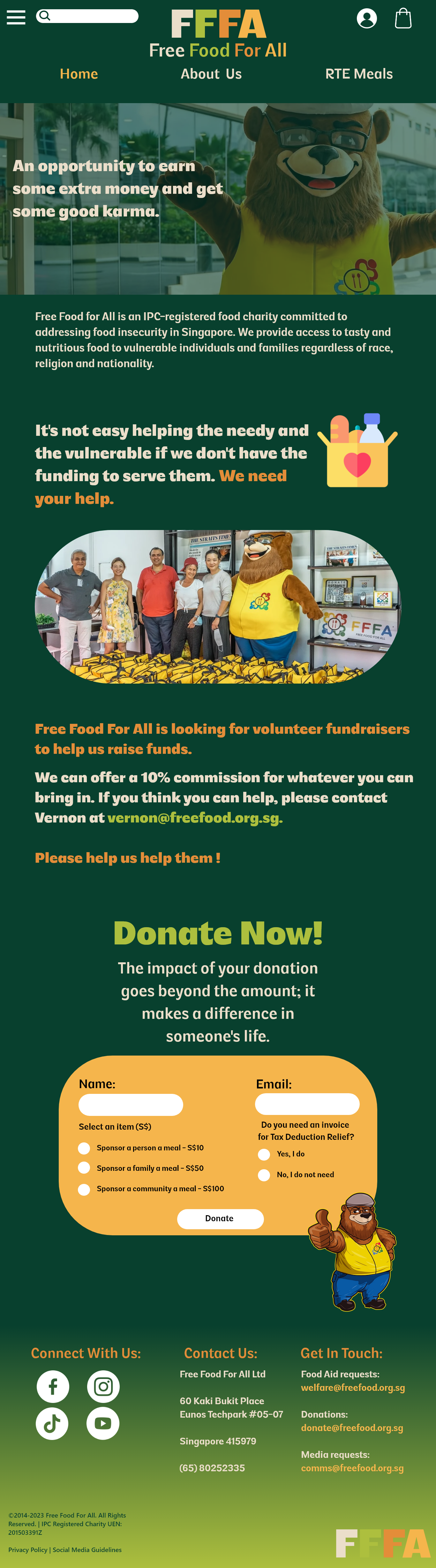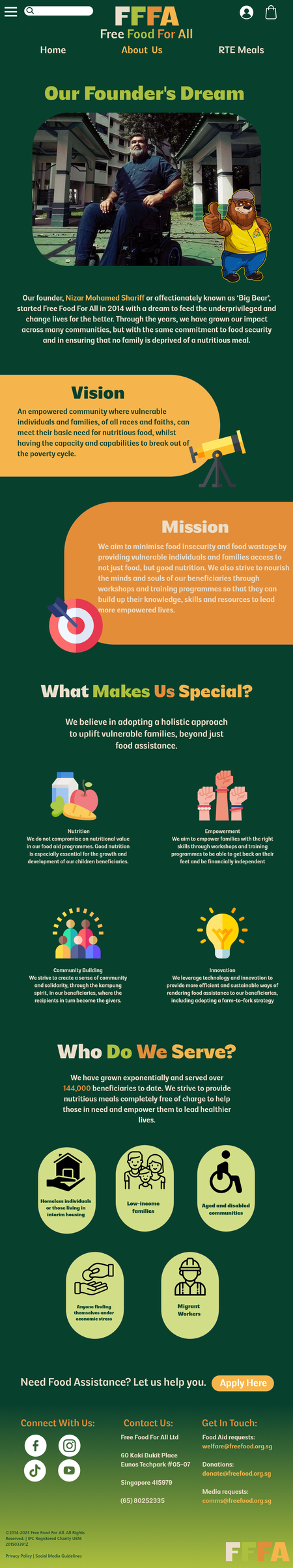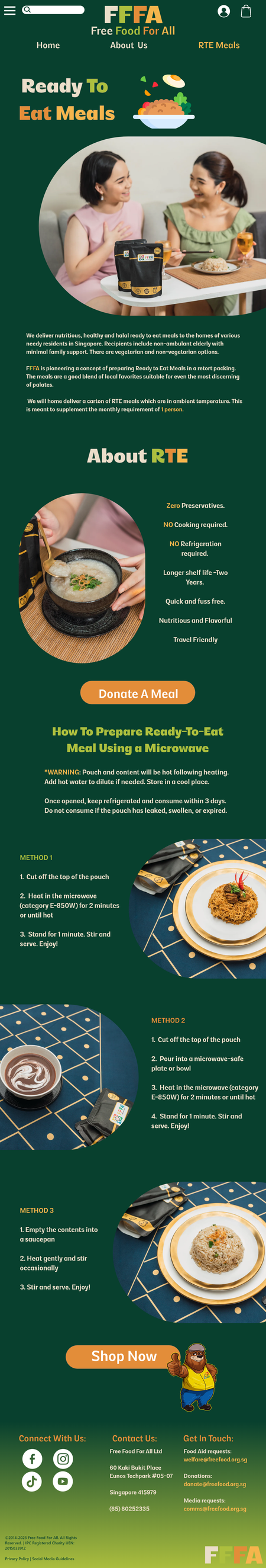 This is my redesign of FFFA's website. I redesigned 3 pages from their website (Home page, About page and RTE Meal page).