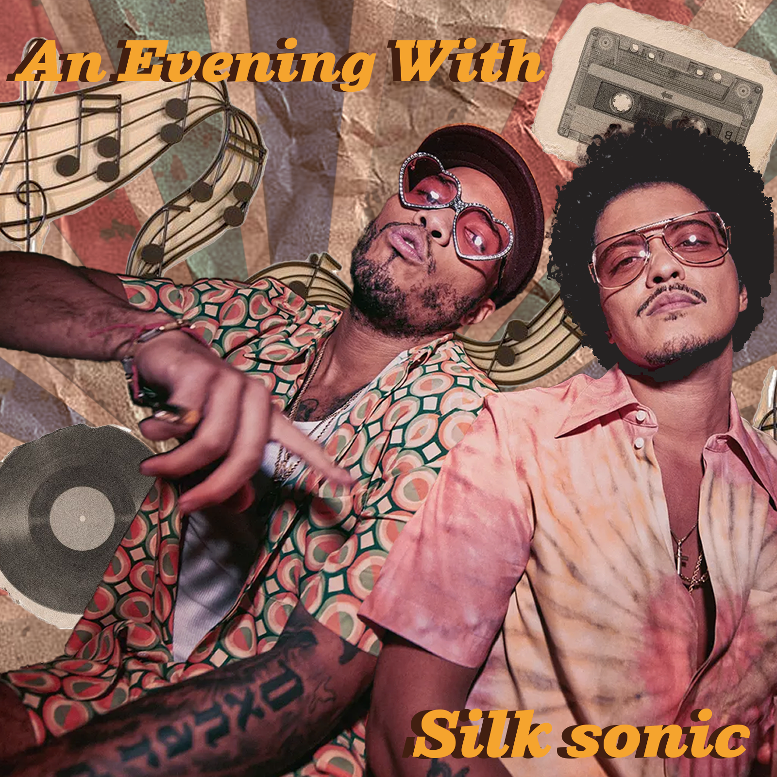 I redesigned Bruno Mars' album with Silk Sonic called "An Evening With Silk Sonic". I used Adobe Photoshop to make this and I integrated a crumpled paper effect in the background. I also added musical elements and changed the hue and tone of the main subject matter.
